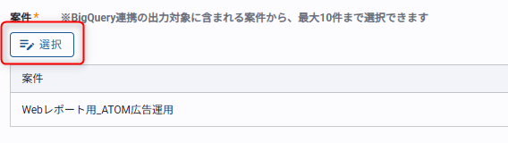 BigQueryの出力対象として設定されている広告主・アカウントが含まれる案件から最大10件まで選択できます。