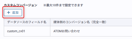 媒体管理画面で設定しているカスタムコンバージョン名を完全一致で入力してください。 媒体を問わず同一名称のカスタムコンバージョンが指標として「データソースのフィールド名」記載のフィールド名でデータソースに追加されます。 |