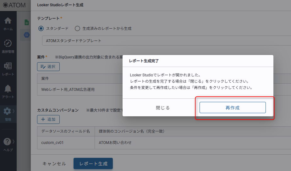 案件数やカスタムコンバージョンが多すぎると生成に失敗する可能性があります