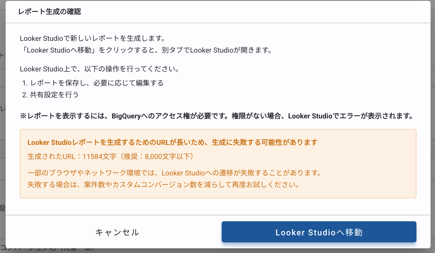 [Looker Studioへ移動]をクリック後、Looker Studioに遷移せずにタイムアウトした場合、レポートに設定する案件数やカスタムコンバージョン数を減らしてください。